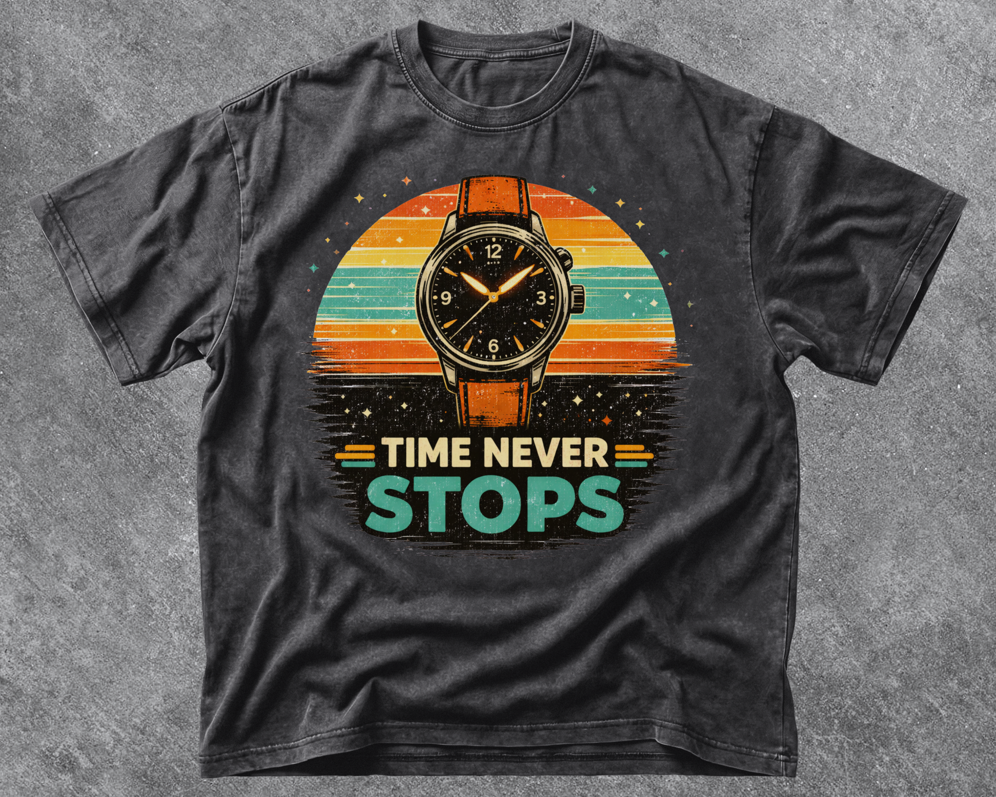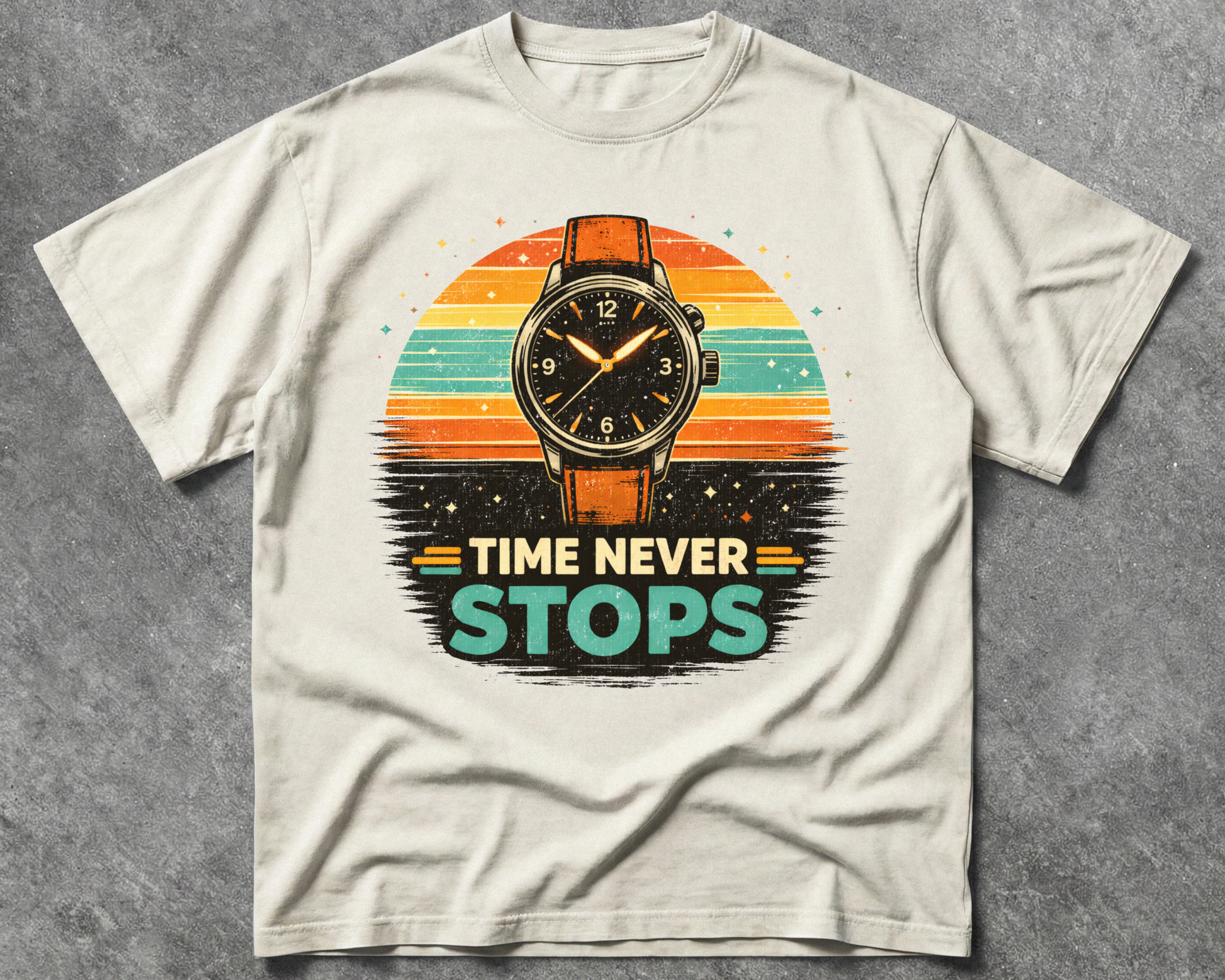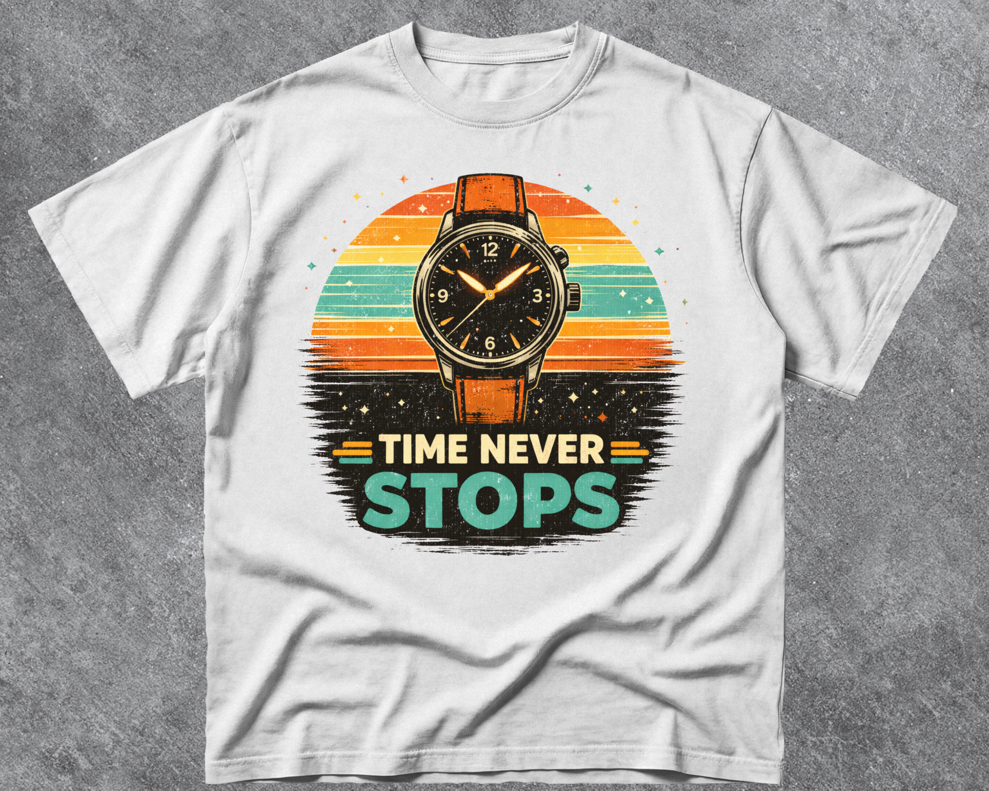 A vintage-inspired design featuring a classic watch and retro sunset tones — a reminder that every moment matters.